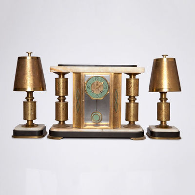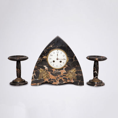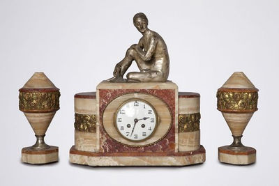 Garniture de cheminée 1925 marbre, régule / genre chryséléphantine 1 pendule, 2 vases