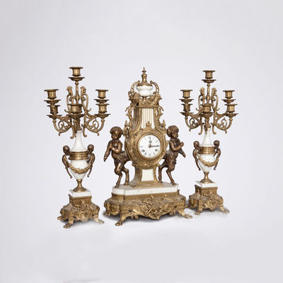 Garniture de cheminée en marbre blanc, bronze ciselé et doré
