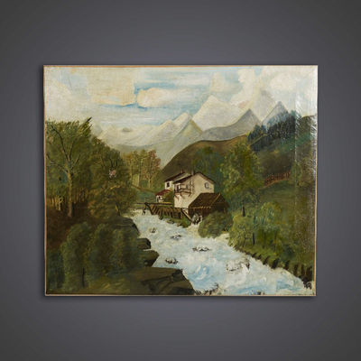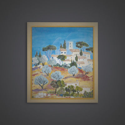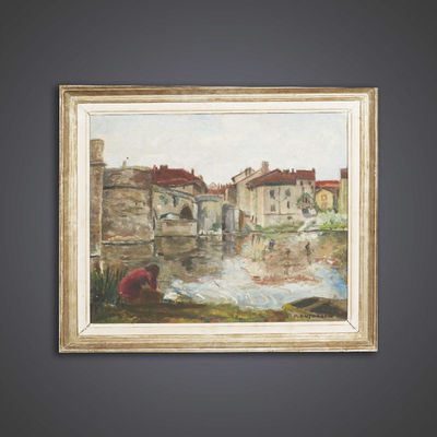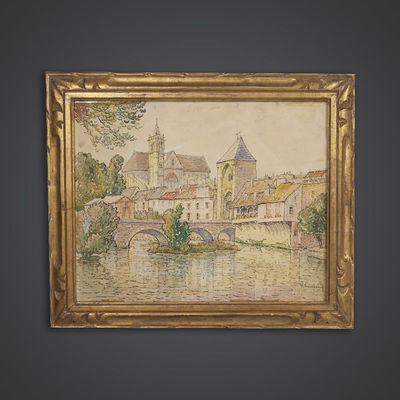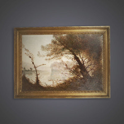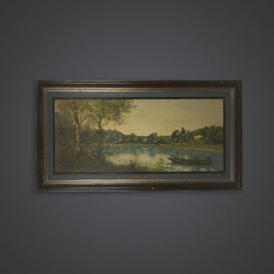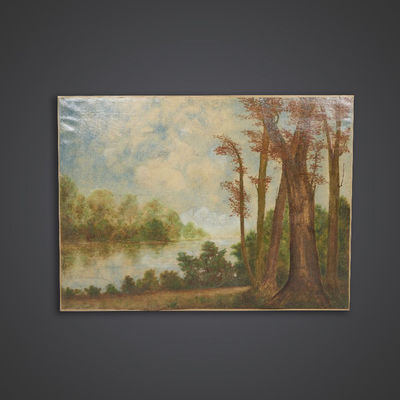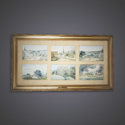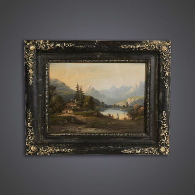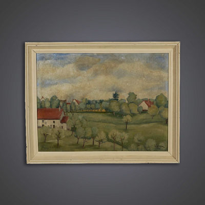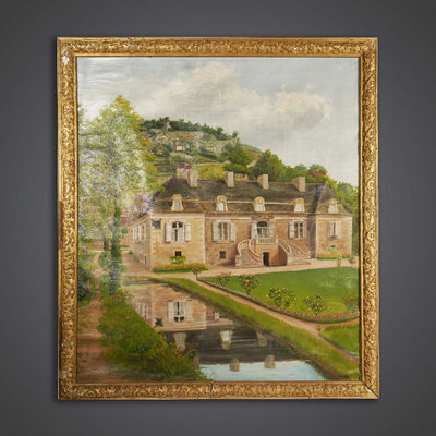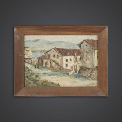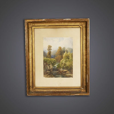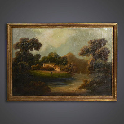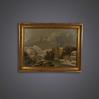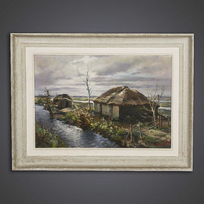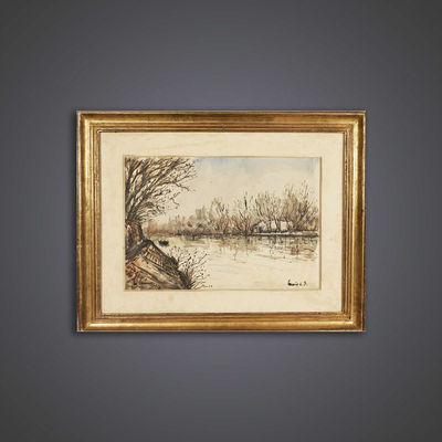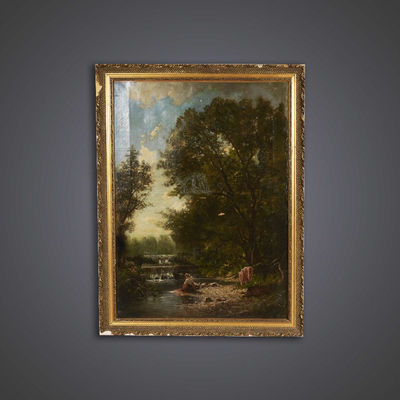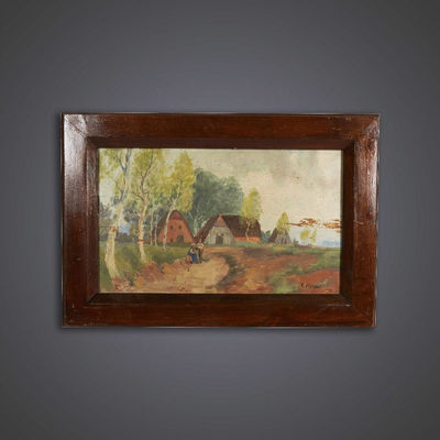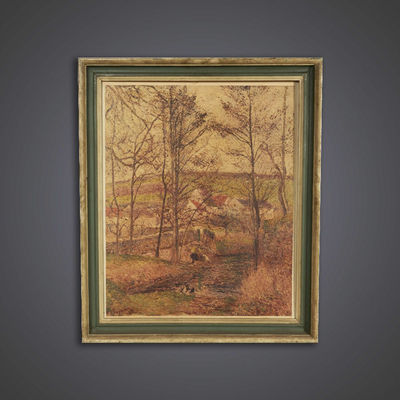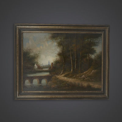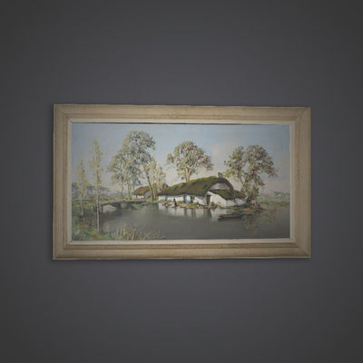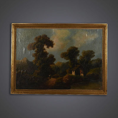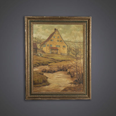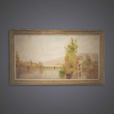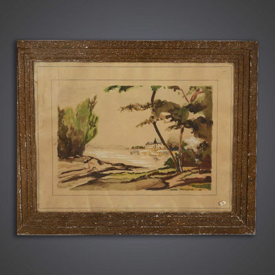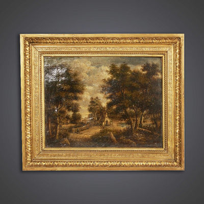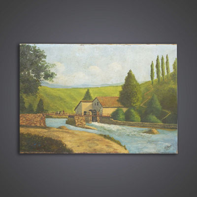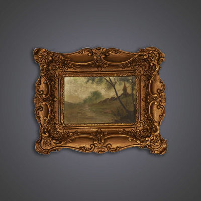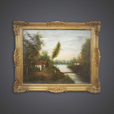 Tableau paysage sous bois, maisons, rivière, cadre plâtre doré