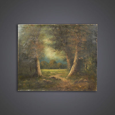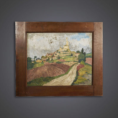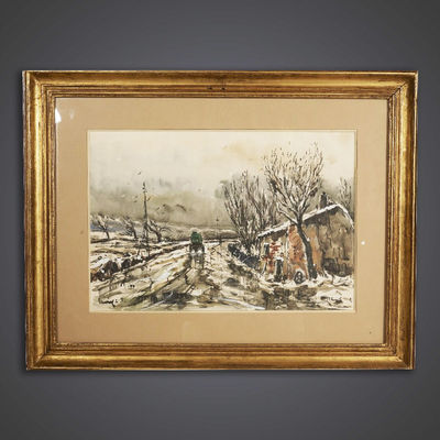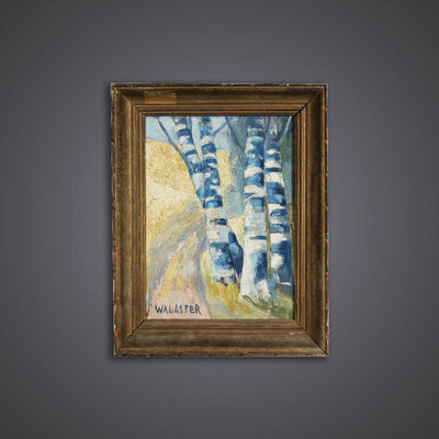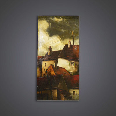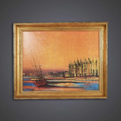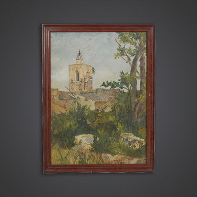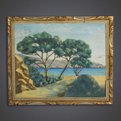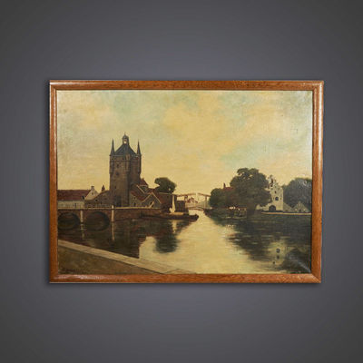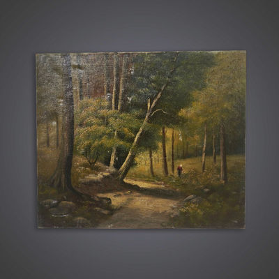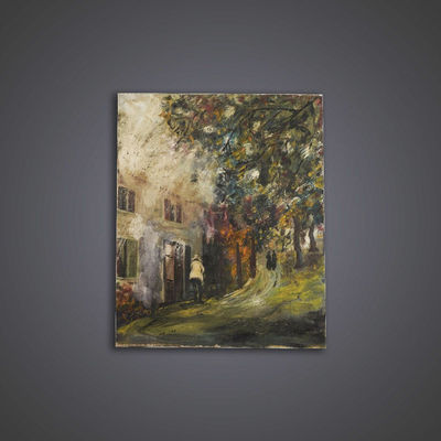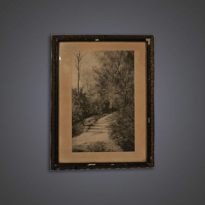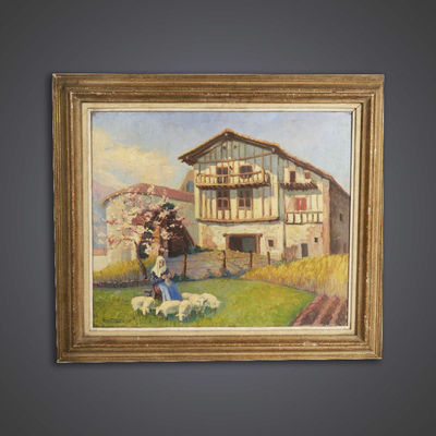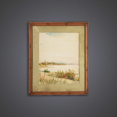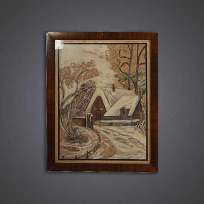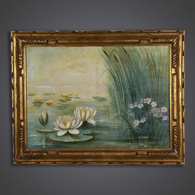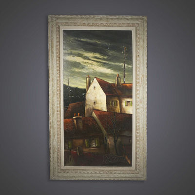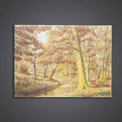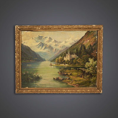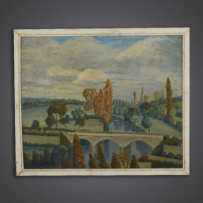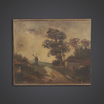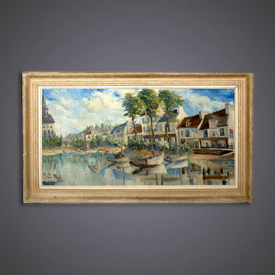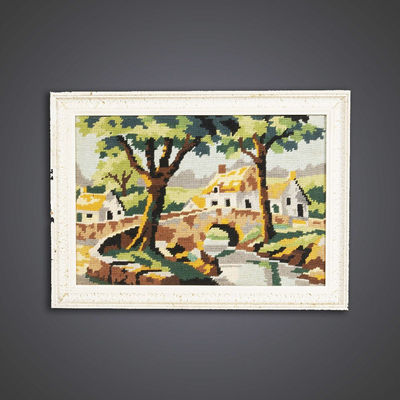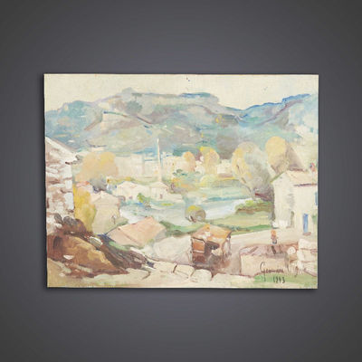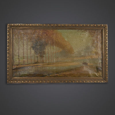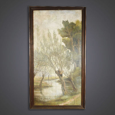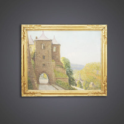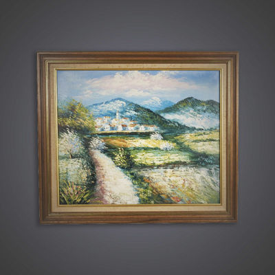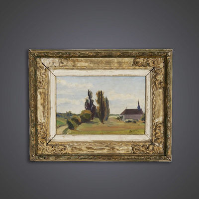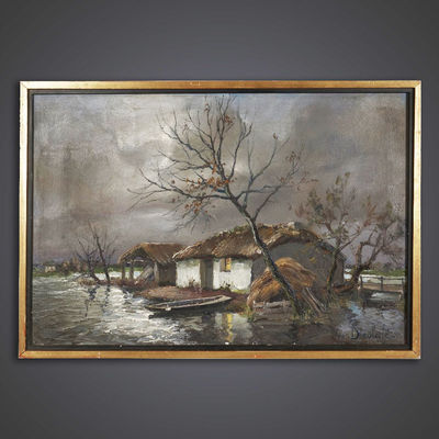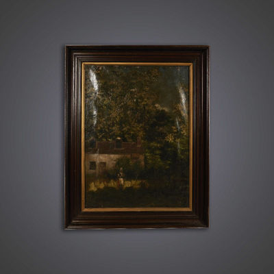 Tableau paysage sous bois, maisons, rivière, cadre plâtre doré