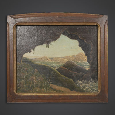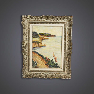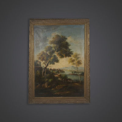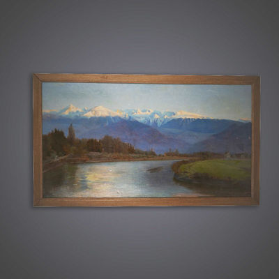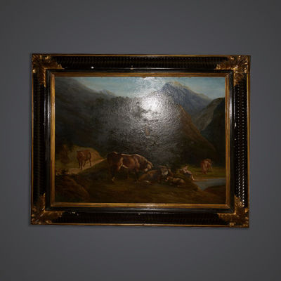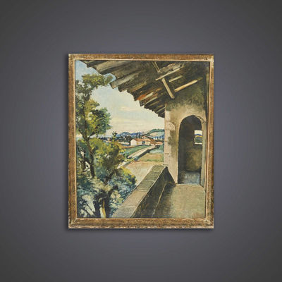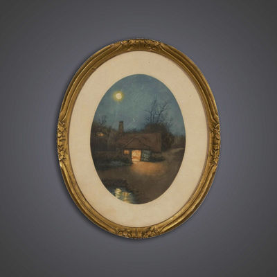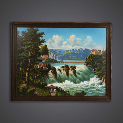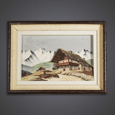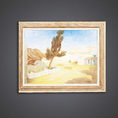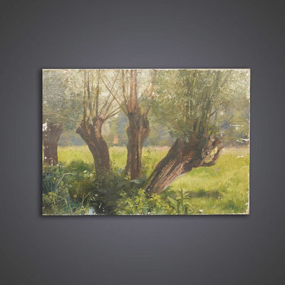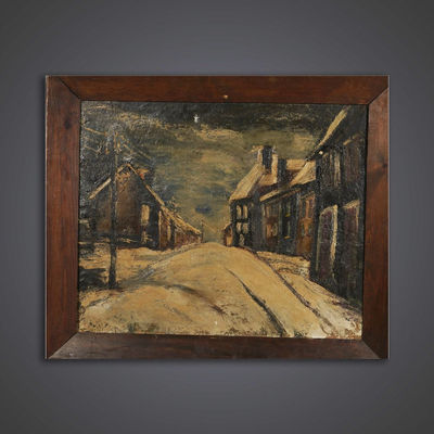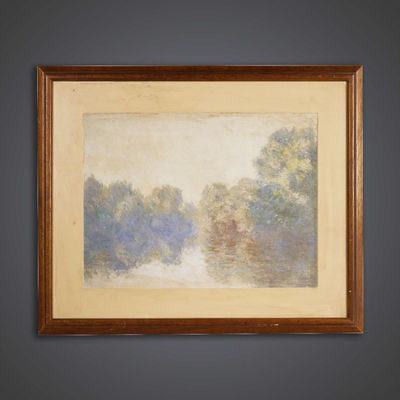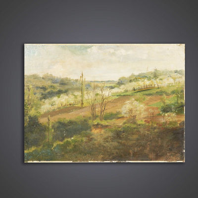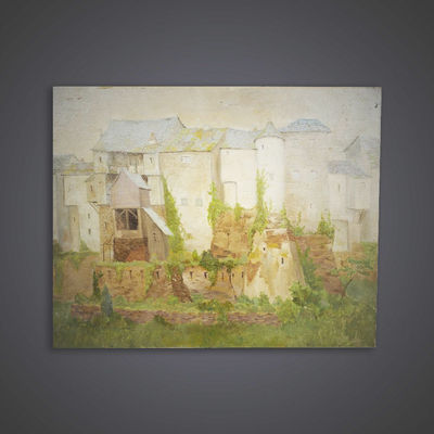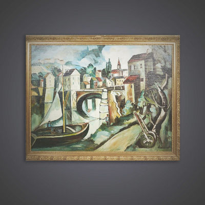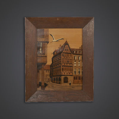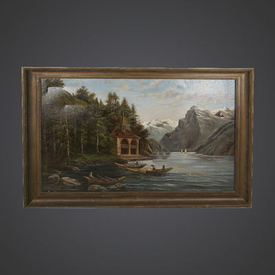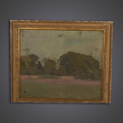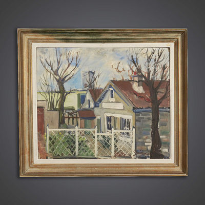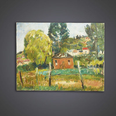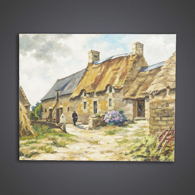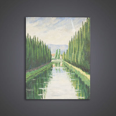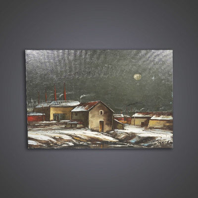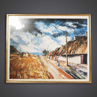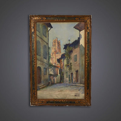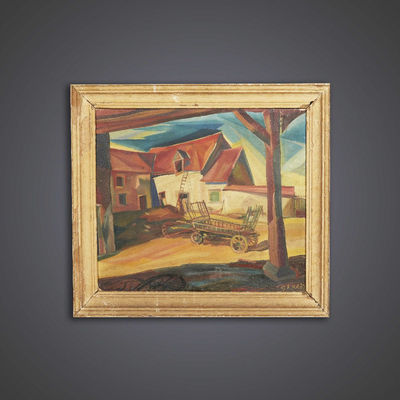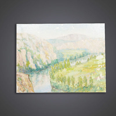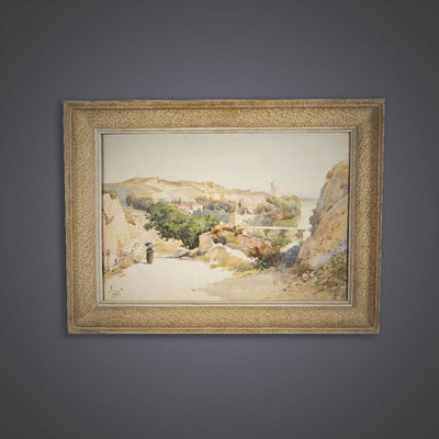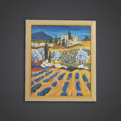 Tableau paysage sous bois, maisons, rivière, cadre plâtre doré