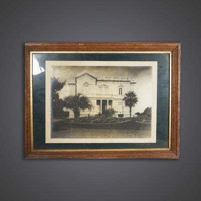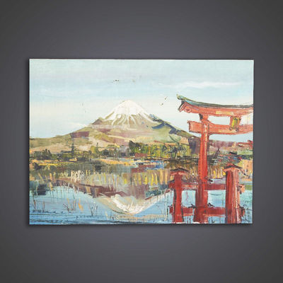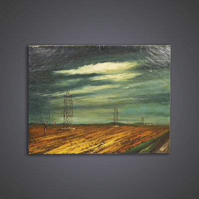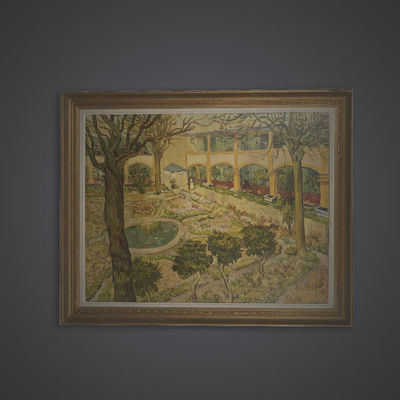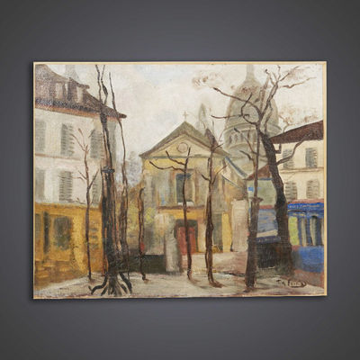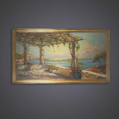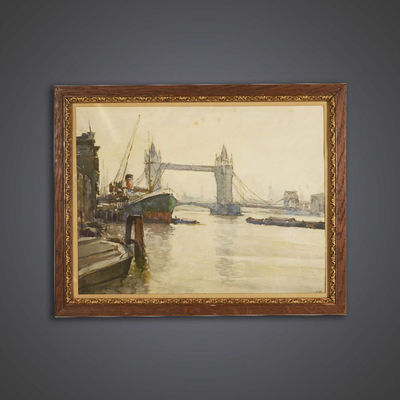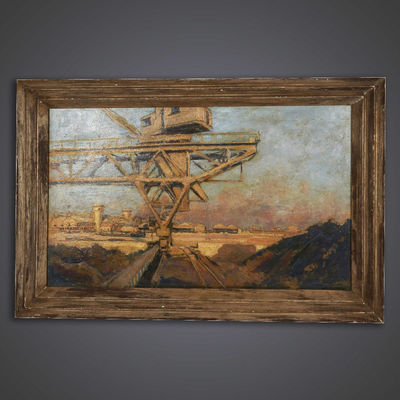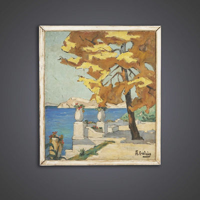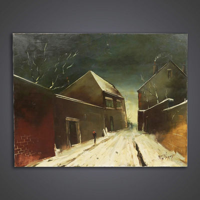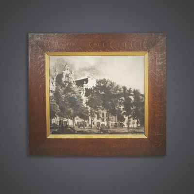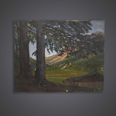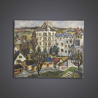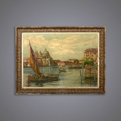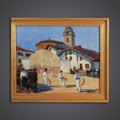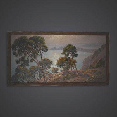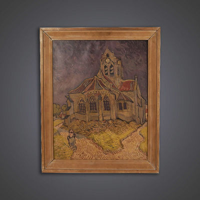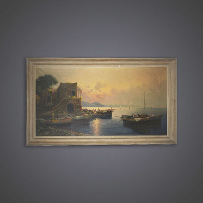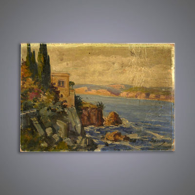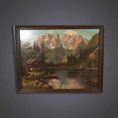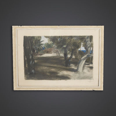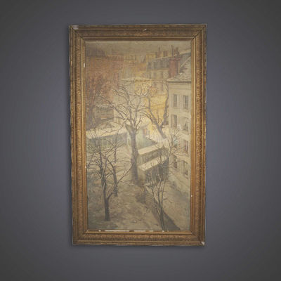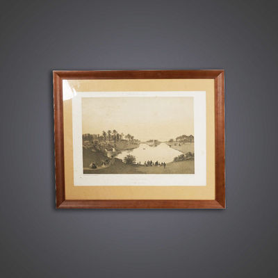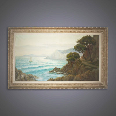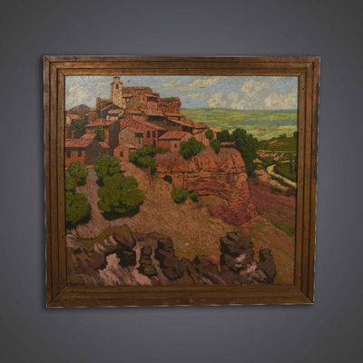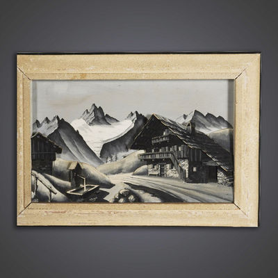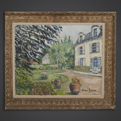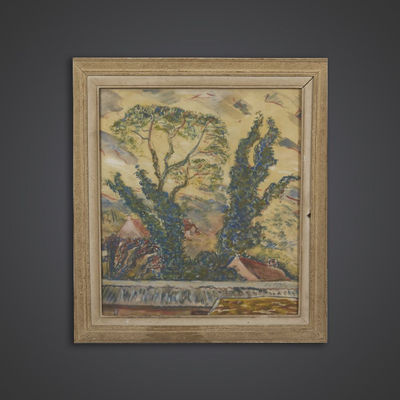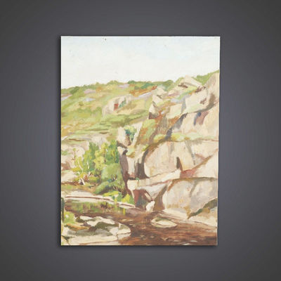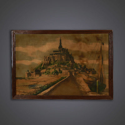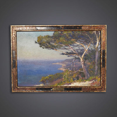 Tableau paysage sous bois, maisons, rivière, cadre plâtre doré